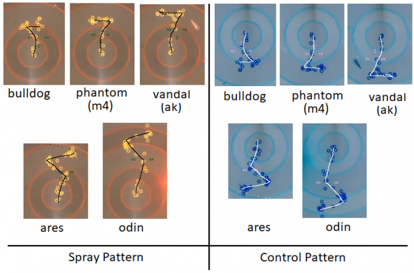 발로란트 총기별 스프레이 왼쪽은 총이 나가는 패턴/ 오른쪽은 플레이어 기준 컨트롤 패턴