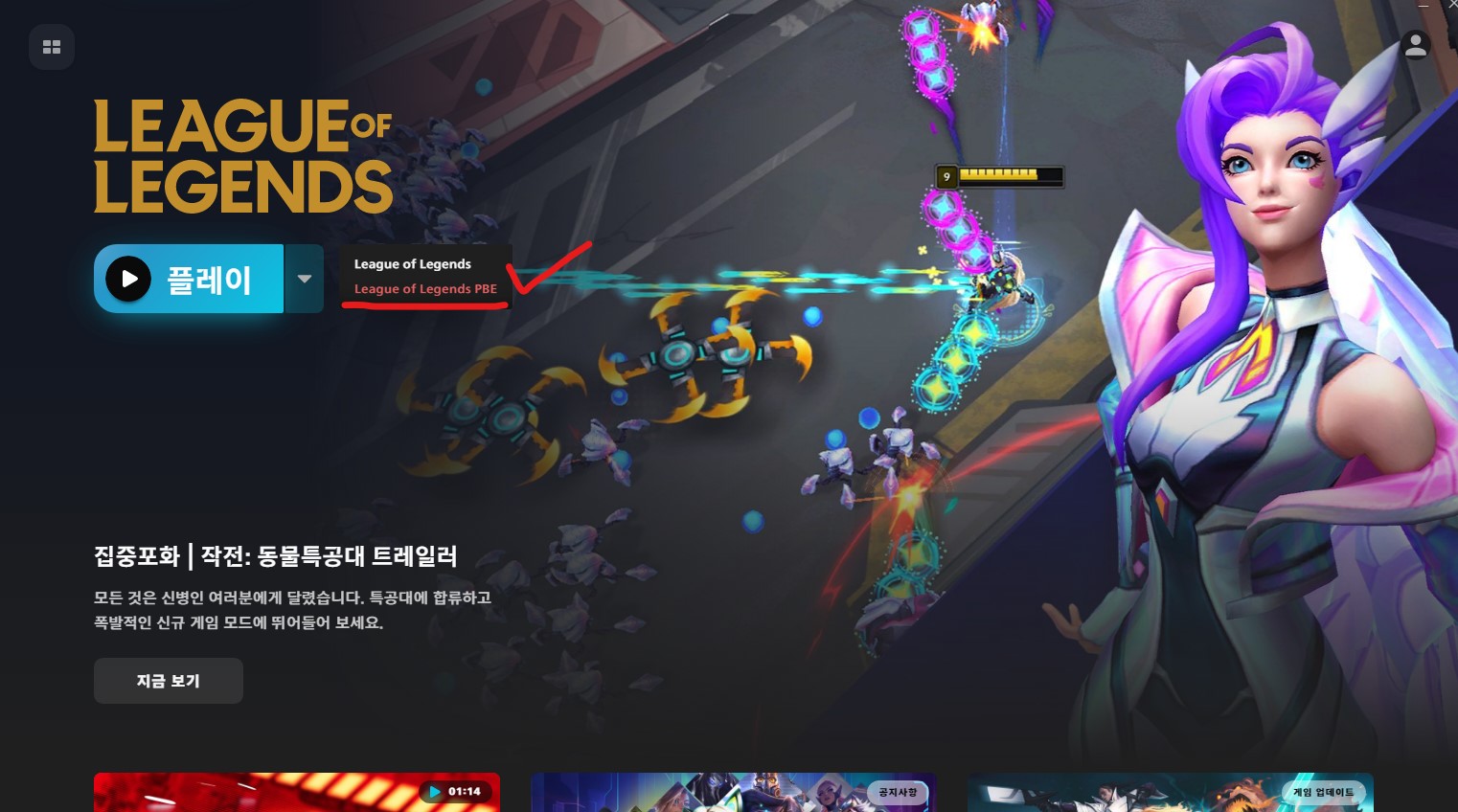 플레이버튼 오른쪽에있는 화살표버튼을 누르고 PBE서버를 선택해준다.